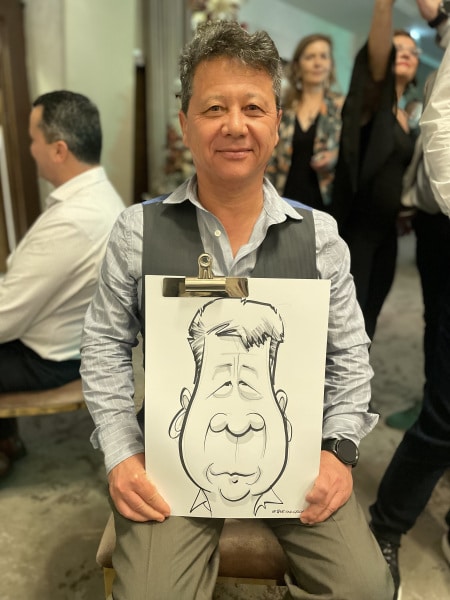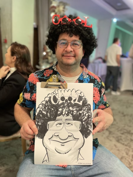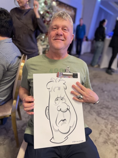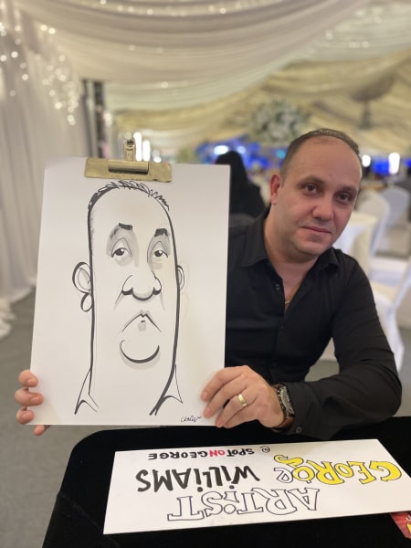 George este unul dintre cei mai rapizi caricaturiști în direct din lume – desenează o caricatură la fiecare 3-4 minute, adică până la 45 în 3 ore! Dar el nu este o mașinărie și amintiți-vă că doar jumătate din oaspeții tăi vor dori un desen, restul le place să privească. Așa este divertismentul!